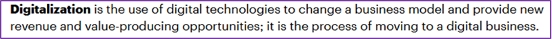 “Digitization是从模拟形式转变为数字形式的过程,也称为数字使能。Digitization采用模拟过程并将其更改为数字形式,而不会对过程本身进行任何不同种类的更改。”“Digitalization是指利用数字技术改变商业模式,并提供创造收入和价值的新机会,它是转向数字业务的过程。”实际上,尼葛洛庞蒂口中的“数字化”以及Gartner定义的Digitization是狭义的数字化,而Digitalization对应的才是我们常说的广义上的数字化。数字化至今也没有官方定义,我们暂且不用纠结英文翻译的问题,关键在于理解数字化的内涵。数字化是利用新一代信息技术,包括云计算、大数据、AI、物联网等,实现研发、生产、运营、管理、营销和服务全方位的数字化,推动业务模式重构、管理模式变革、商业模式创新和企业核心能力的提升。数字化是在信息化的基础上把业务转化为数据,并以数据驱动业务的发展。数字化是企业由实体经济向数字经济的转变,是企业由物理世界向数字世界的迁移。从以上的定义中,其实还是很难明确的分辨出信息化与数字化的区别。我们不用沉迷于分辨各种名词、术语,而是从本质内涵来深入解读它们的差异。